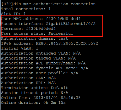 此时查看交换机上mac地址认证用户的详细信息,mac地址为f430-b9d0-ded4的终端在G1/0/2接口认证成功,用户名是f430b9d0ded4