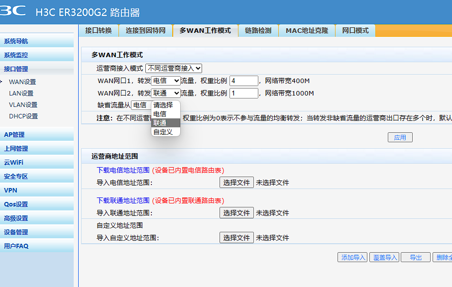 我PPPoE拨号了移动的宽带,怎么设置移动的流量转发到WAN口1呢??没有文档去说明“自定义地址范围”的文档格式啊