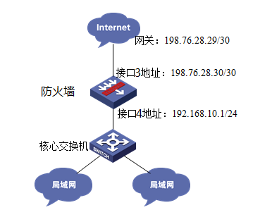 将防火墙部署在互联网出口,使用固定IP地址线路接入互联网。运营商提供的IP地址为198.76.28.30/30,网关为198.76.28.29,DNS地址为114.114.114.114。初步规划防火墙使用3接口接入运营商,使用4接口连接内部网络,内部网络使用192.168.10.0网段,要求内网终端可以自动获取到地址并可以访问互联网。