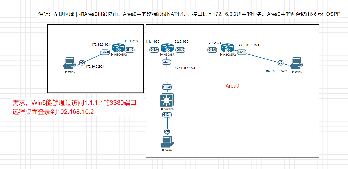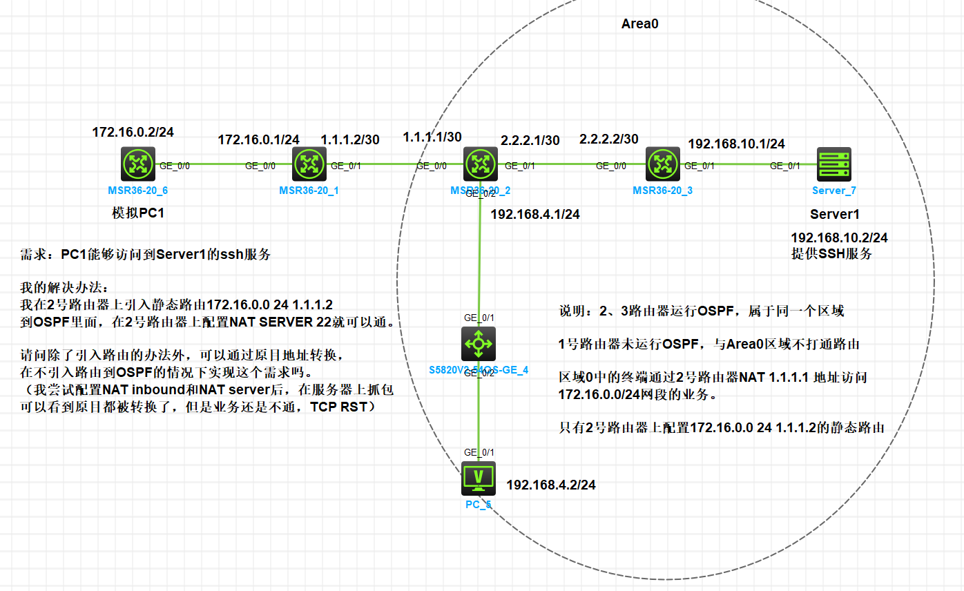 我简化了一下,就是按照您说的,映射还是按普通的映射配置,只配置了nat outbound address-group1 和nat server,其他的没有配置。然后在中间路由器把静态路由172.16.0.0 255.255.255.0 1.1.1.2 引入到ospf中了,这样就可以通过去了。 但我原先想的是能不能通过原目地址转换实现,不把这条路由引入到ospf里,因为这条路由只是这个中间路由器使用的,ospf区域里不应该都学到这条路由。