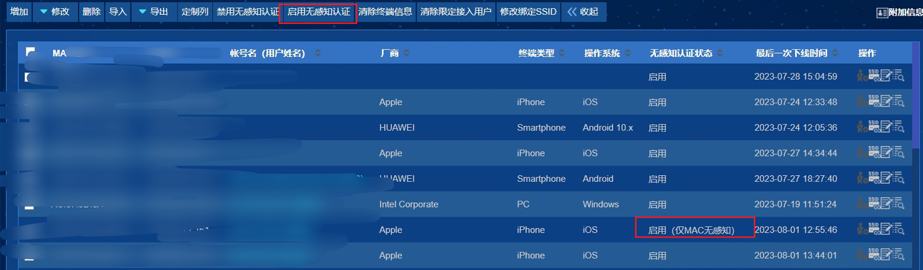 在终端管理-终端设备管理里面 发现有的终端 无感知认证状态处会显示 禁用(自动),在上面菜单启用无感知认证后显示仅MAC无感知,请问这个状态正常吗