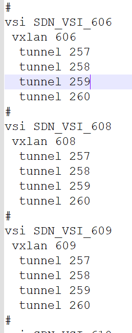 如下图,当leaf上一个接口下配置了多个service-instance,每个vsi绑定的vxlan id不同,隧道相同。
