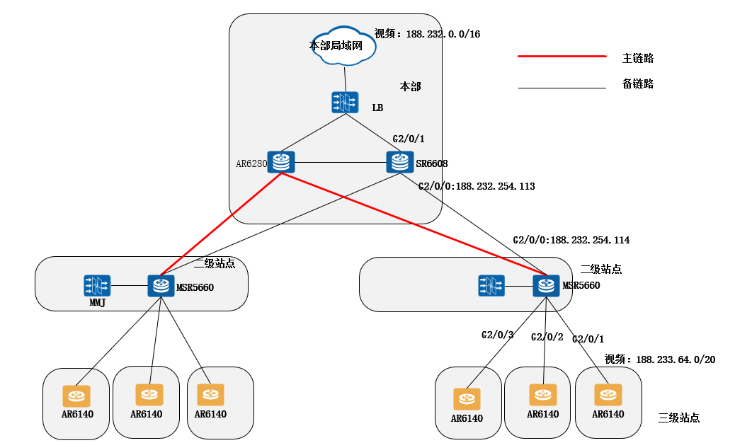 通过在SR6608及MSR5660做策略路由,使视频流优先走备链路,仅当备链路down掉之后切到主链路。