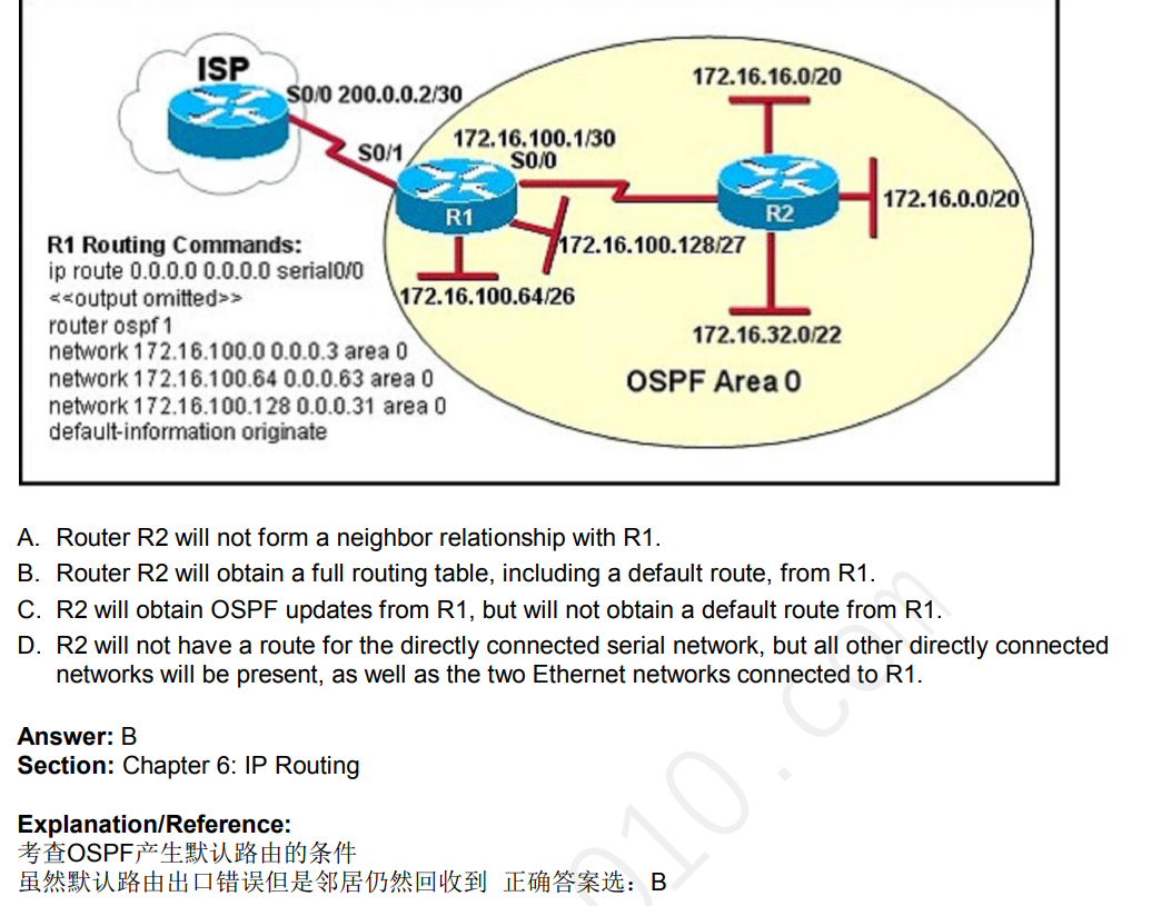 宣告串口路由错误。: router osps 1 network 172.16.100.1 0.0.0.3 area 0 ,这样宣告S0 /0链路才对 。既然宣告链路错了,为什么R2还能正常建立路由 并且获得完整的路由表?