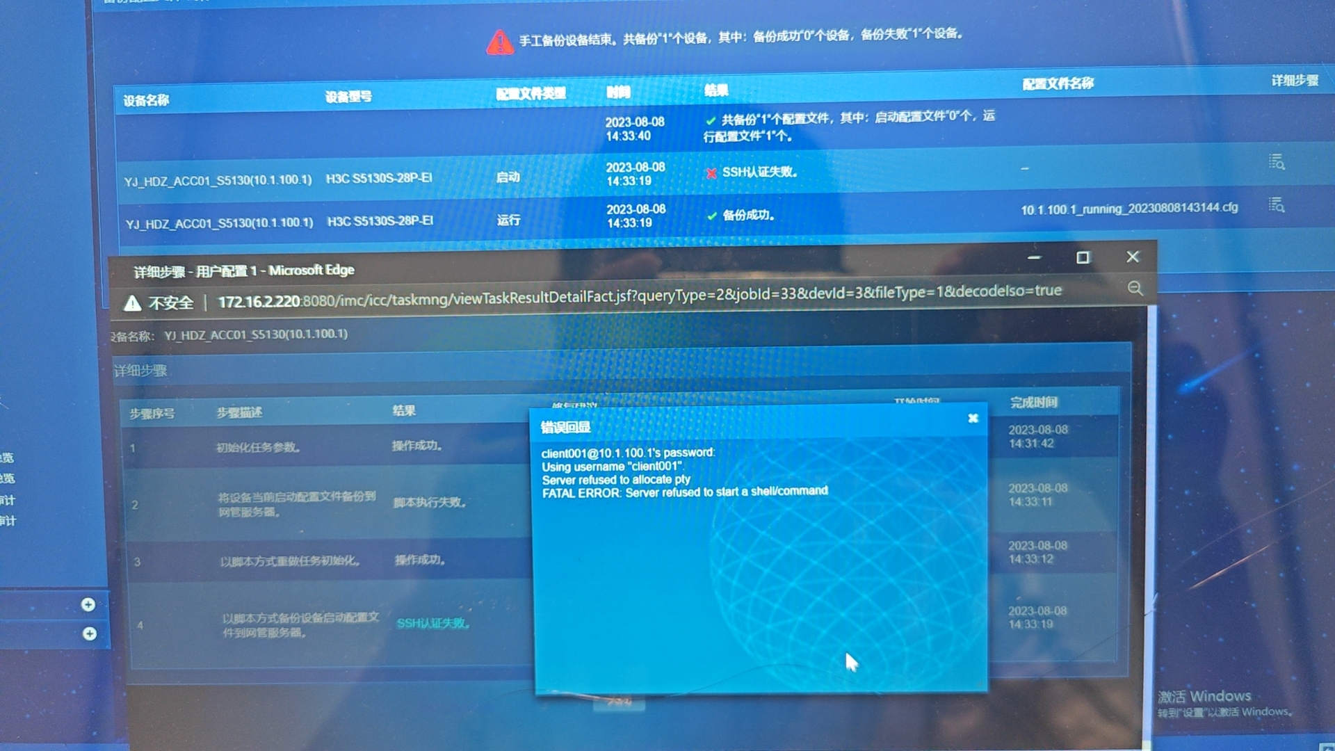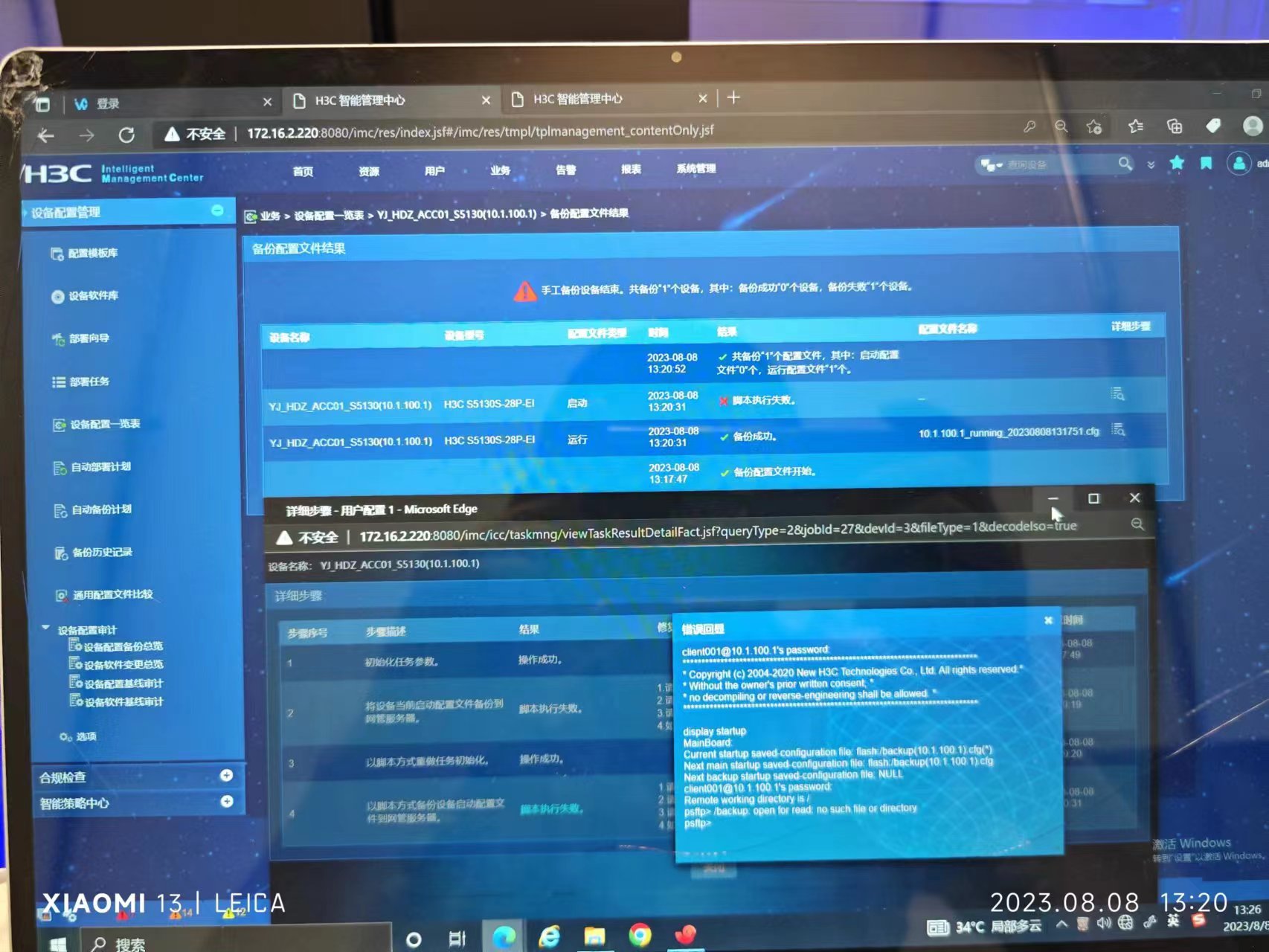 设备的snmp和ssh都通过了测试,ssh的账户是管理员权限。icm点备份的时候出现脚本执行时报错。imc只备份了配置文件,没有备份启动文件。附加交换机运行配置。