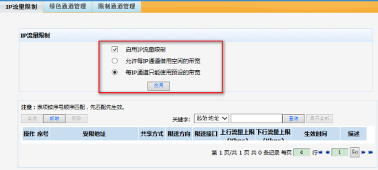1、启用IP流量限制功能,并设置您所需的限制方式:勾选【启用IP流量限制】,选择【每IP通道只能使用预设的带宽】,单击【应用】按钮生效。