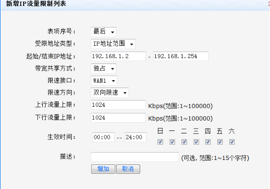 2、添加限速规则:单击【新增】按钮,在弹出的对话框中设置限速规则,单击【增加】按钮完成操作。例如:对内网192.168.1.0网段的每个IP进行1024Kb/S的限速,则配置如下图: