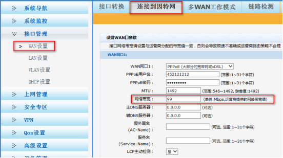 (2)IP流量限制中,会选择限速接口,因此请确保选中的WAN口带宽值与运营商分配的带宽值一致,否则会导致限速不准确。在【接口管理】--【WAN设置】--【连接到因特网中】设置【网络带宽】。