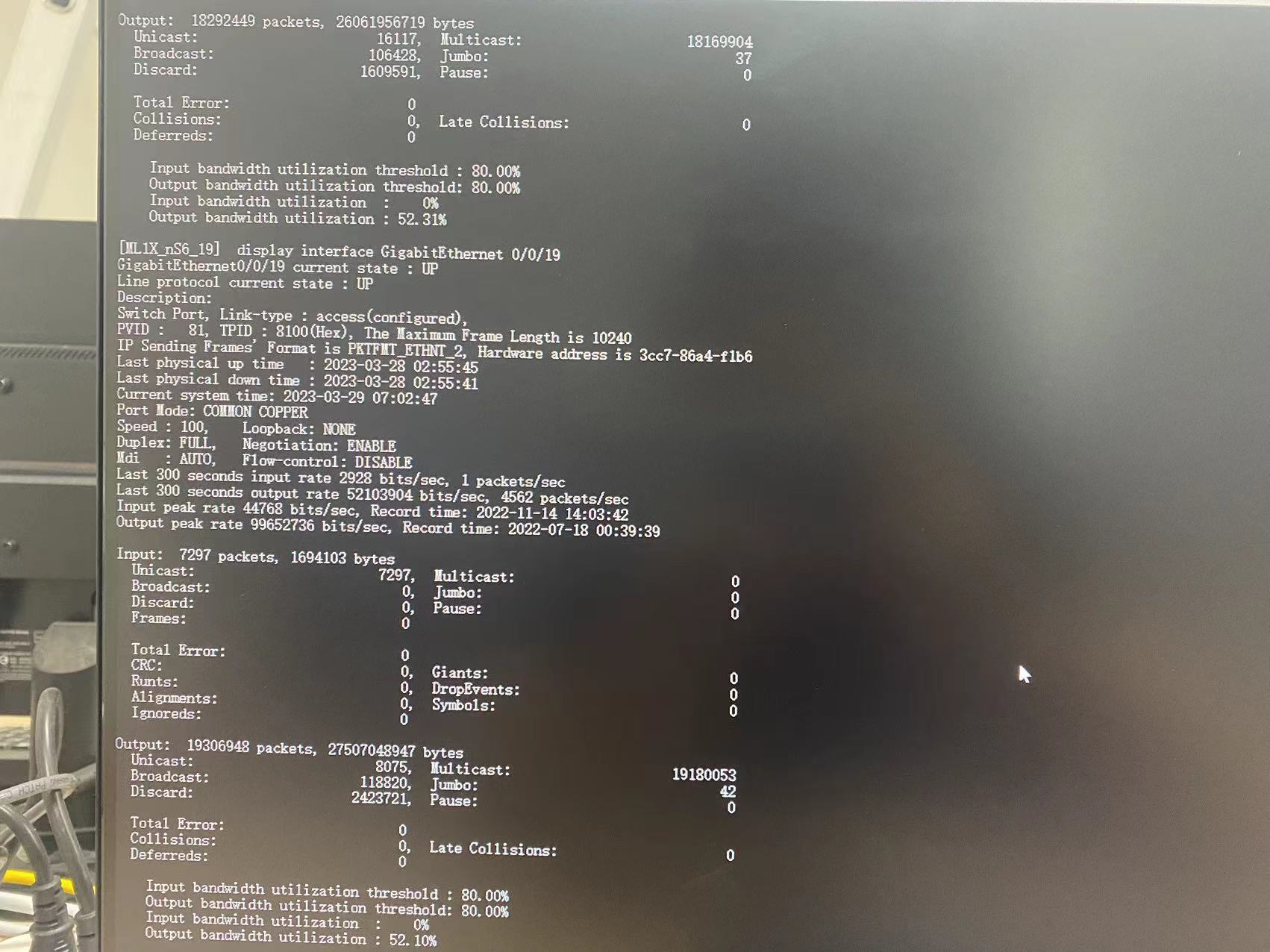 如图,交换机出口输出带宽占用率为52%多的端口接的终端协商的端口都为100M,其他网段ping这些端口的ip都掉包,接口下Discard包很多。输出带宽占用率5%多都为1000M,ping这些端口的ip都不掉包,接口下Discard包没有。这是什么原因造成的啊?