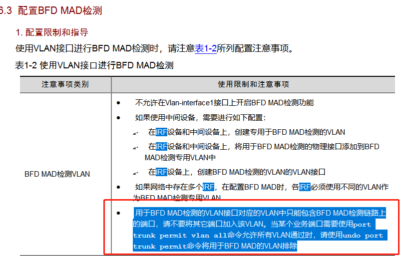 BFD MAD检测VLAN | · 不允许在Vlan-interface1接口上开启BFD MAD检测功能 · 如果使用中间设备,需要进行如下配置: ¡ 在IRF设备和中间设备上,创建专用于BFD MAD检测的VLAN ¡ 在IRF设备和中间设备上,将用于BFD MAD检测的物理接口添加到BFD MAD检测专用VLAN中 ¡ 在IRF设备上,创建BFD MAD检测的VLAN的VLAN接口 · 如果网络中存在多个IRF,在配置BFD MAD时,各IRF必须使用不同的VLAN作为BFD MAD检测专用VLAN · 用于BFD MAD检测的VLAN接口对应的VLAN中只能包含BFD MAD检测链路上的端口,请不要将其它端口加入该VLAN。当某个业务端口需要使用port trunk permit vlan all命令允许所有VLAN通过时,请使用undo port trunk permit命令将用于BFD MAD的VLAN排除 |