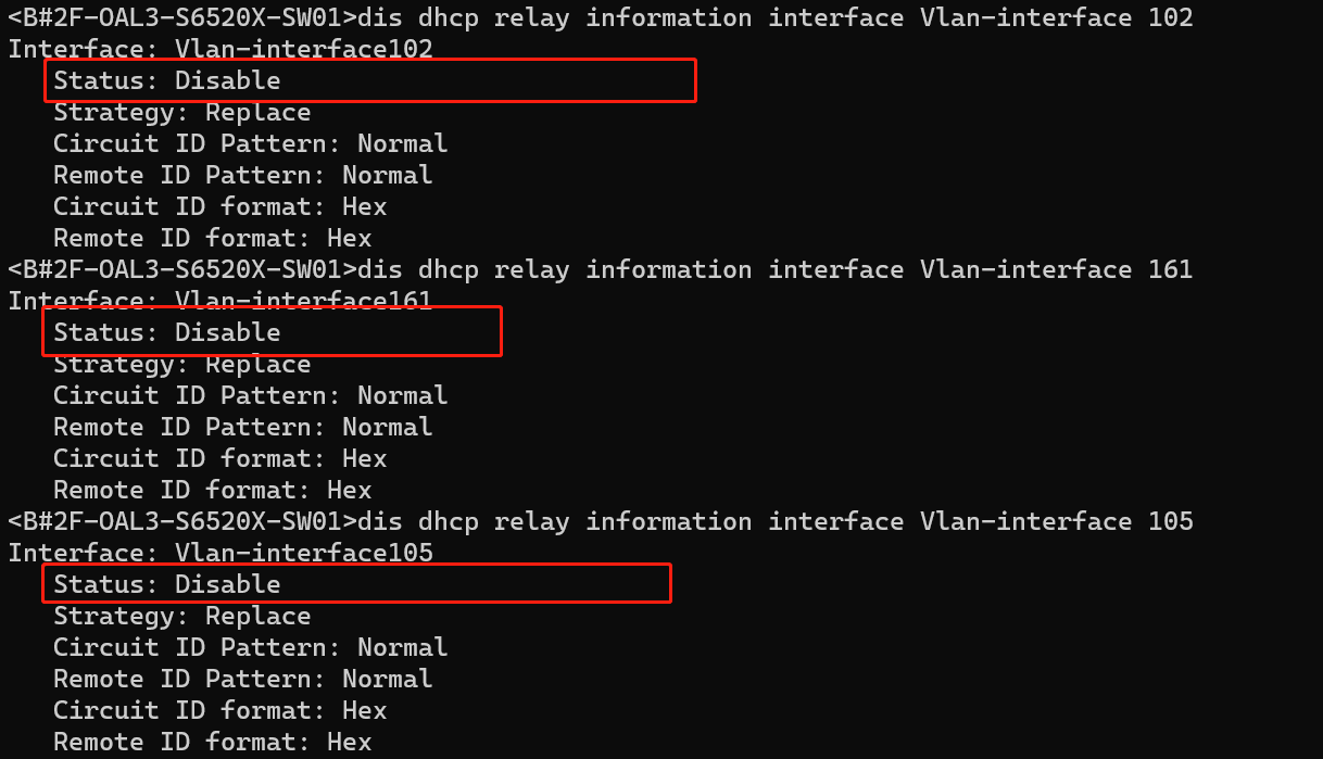 将网关从老核心迁到新核心,配置完成dhcp中继,dhcp服务器不动,迁移了10个网关,其中2个IP段无法获取地址,其他正常,这两个段迁移前是正常能获取地址的