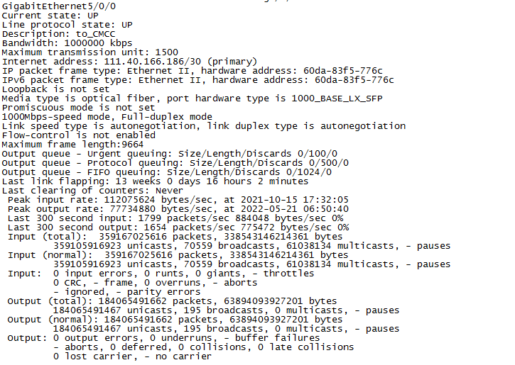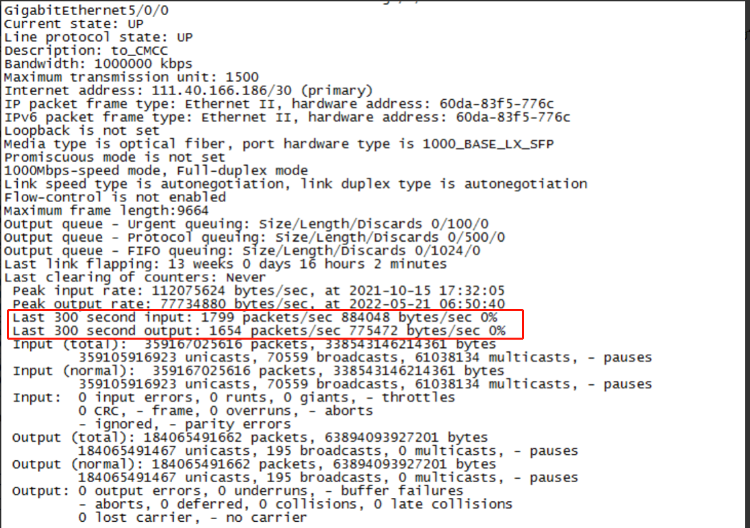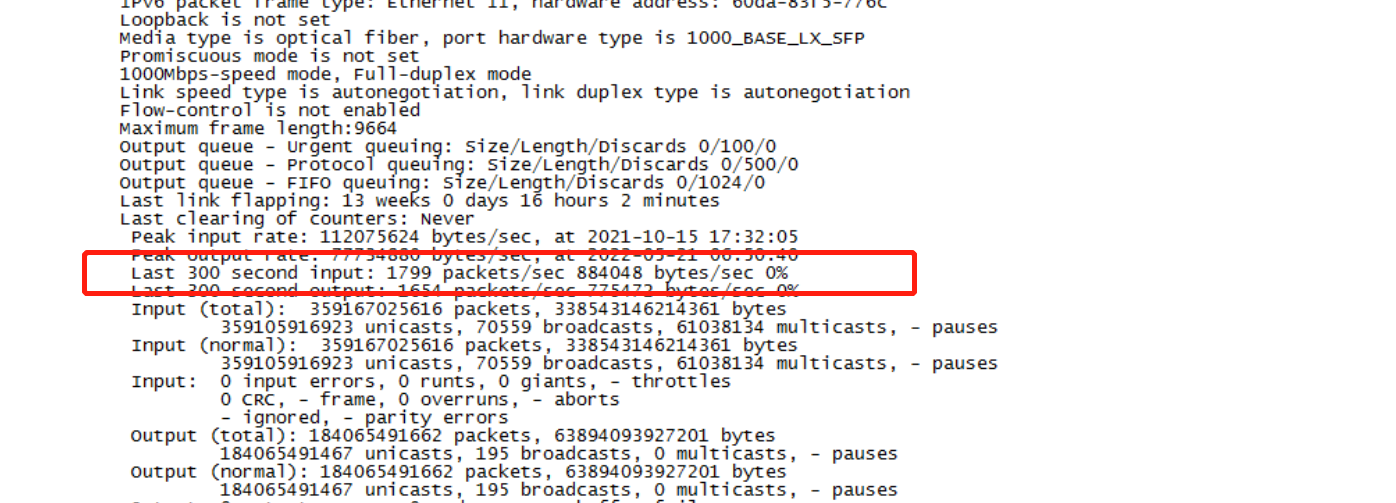 4.查看接口历史使用率及出入方向的字节:dis int | inc sec