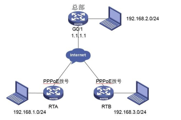 MSR 分支路由器采用 PPPoE 拨号方式上网,IP 地址不固定,MSR 总部路由器外网口 G0/1 的地址为 1.1.1.1(模拟运营商公网固定地址环境)。要实现对分支 1 所在的内网(192.168.1.0/24)与分支 2 路由器所在的内网(192.168.3.0/24)之间的数据流进行安全保护,实现两端内网终端通过与总部建立 IPsec VPN 隧道进行互访。