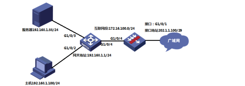 [H3C-GigabitEthernet1/0/1]nat server protocol tcp global 202.1.1.100 8081 inside 192.168.1.88 8081 //配置nat映射, 将公网地址202.1.1.100、协议tcp、端口8081,映射到内部服务器192.168.1.88的8081端口