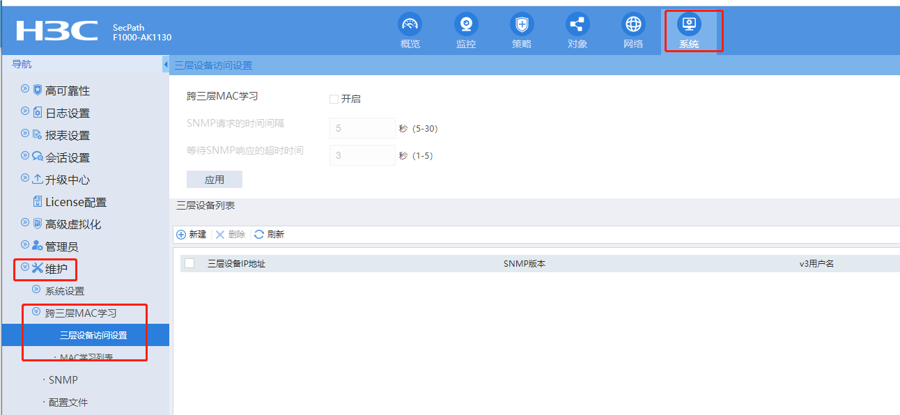 配置防火墙的跨三层Mac学习功能、启用,配置snmp 、