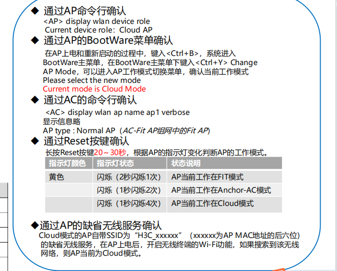 有可能是工作在cloud 模式;在AP的无线网络范围内,搜SSID为“H3C_xxxxxx”(xxxxxx为设备MAC地址的后六位),如果是这样显示,那你的ap是工作在云模式下,所以你的AC不能正常纳管此ap;