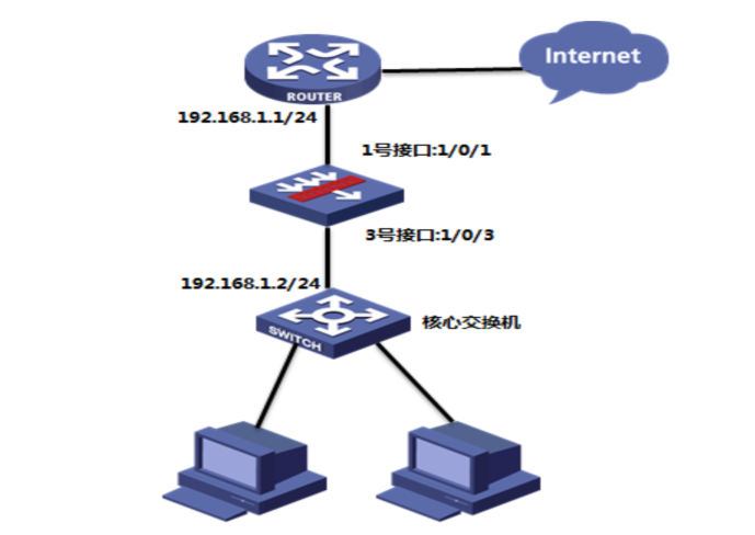 如下组网图所示,在原有的网络中增加防火墙来提高网络安全性,但又不想对原有网络配置进行改动,所以需要防火墙采用透明模式部署;其中GigabitEthernet 1/0/1接口接原有路由器的下联口,GigabitEthernet 1/0/3接口接原有的交换机上联口。