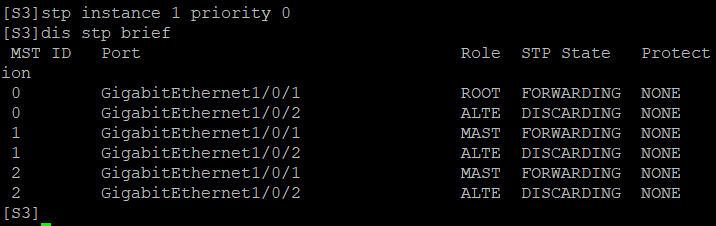 如上图,启动设备后,S1为根桥,S3的GE1/0/2阻塞,S3的 instance 1 优先级修改为 0后,此时S3的GE1/0/2接口不应该是 forwarding吗?