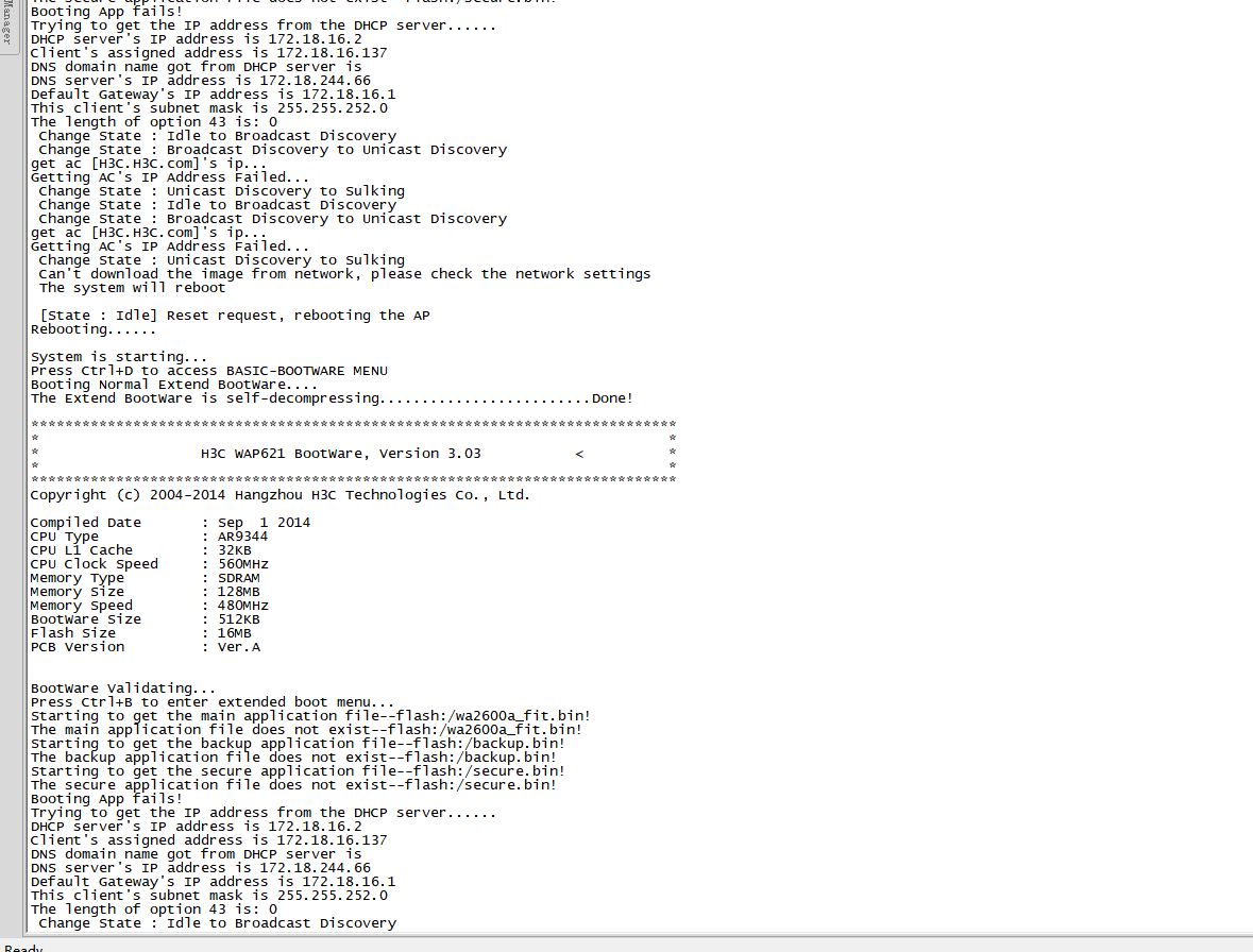 目前你的ap提示从dhcp server 以获取地址,但是没有获取到option 43 的AC地址;无法上线,无法下载版本,一直重启;