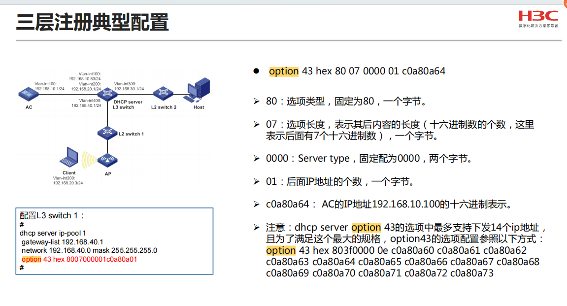 三层注册,option 43 配置方法参考: