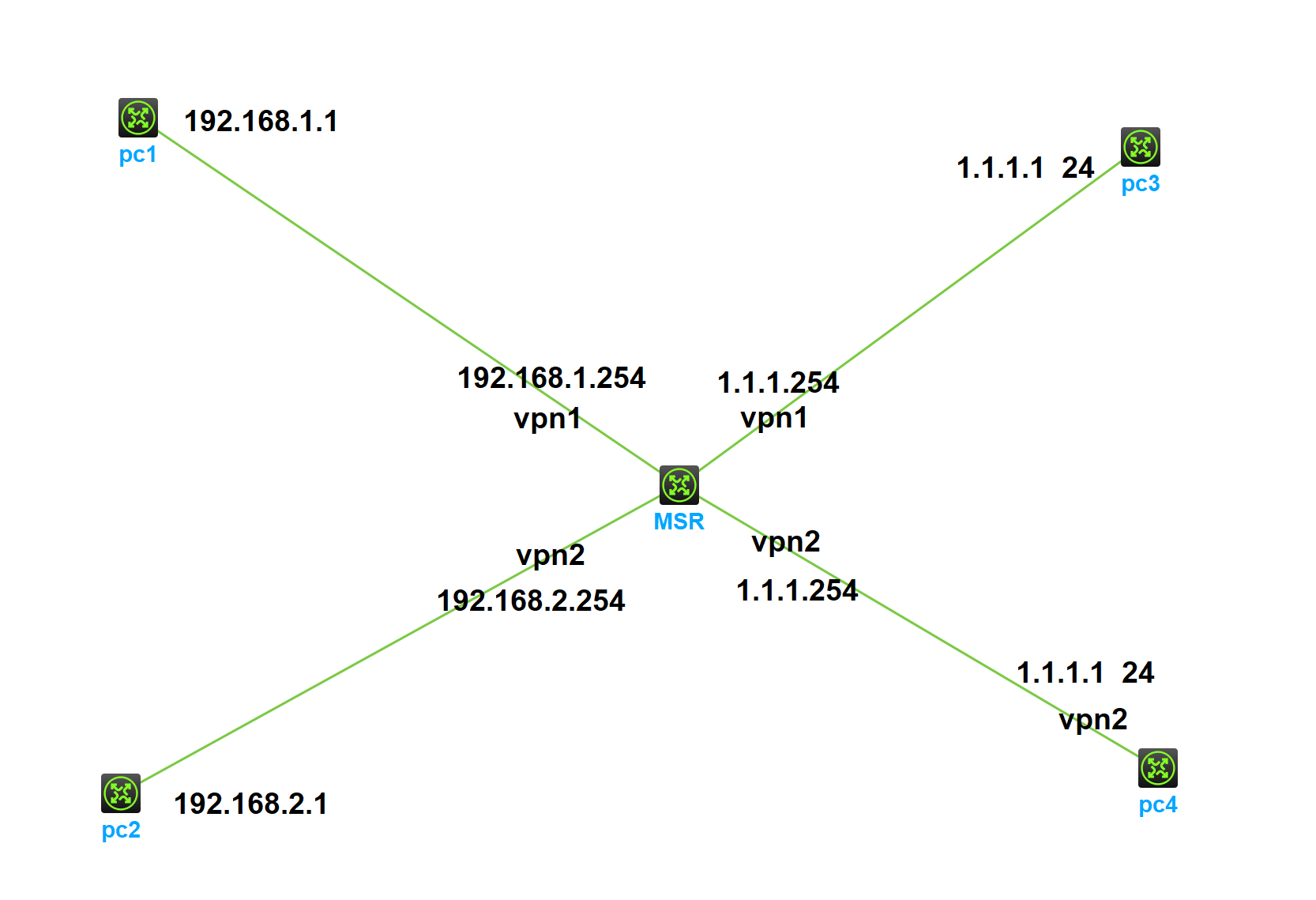 问题:如何确定 pc1 和 pc2 在ping的过程中,目的IP(1.1.1.1)是走的哪一个vpn-instance