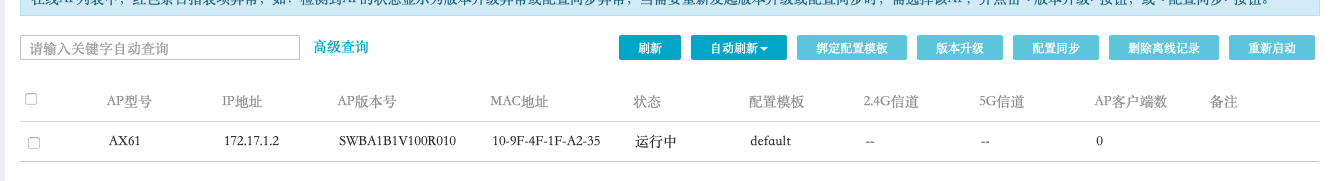 AX61 通过交换机接入 ER5200G3。在路由器的管理页面上可以看到 AX61,AX61的页面上也可以 ping 通外网。但是使用手机或者电脑都无法找到 WiFi,在管理页面上也显示信道未 “-”