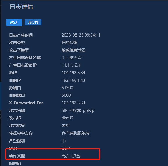 防火墙中IP的特征预定义动作为丢弃,为什么在态势感知的相关日志是允许+抓包,如下两张图