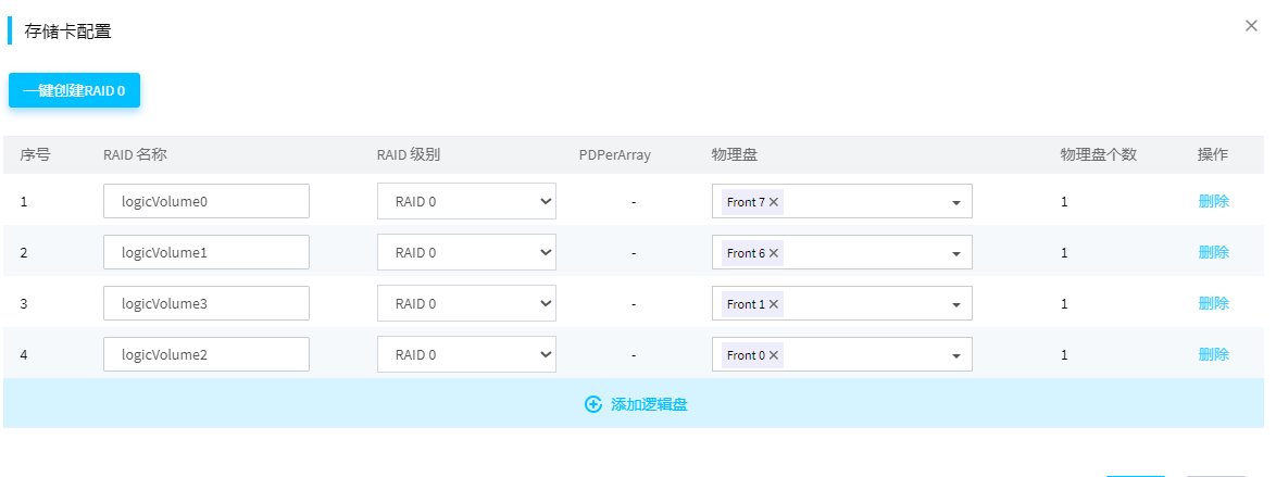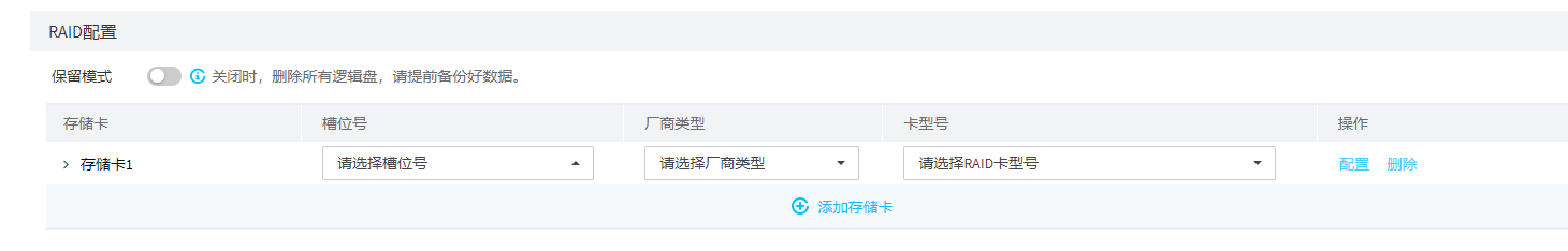 然后在FIST的服务器添加配置界面下的RAID配置,开启保留模式,将一配置好的阵列信息进行填写