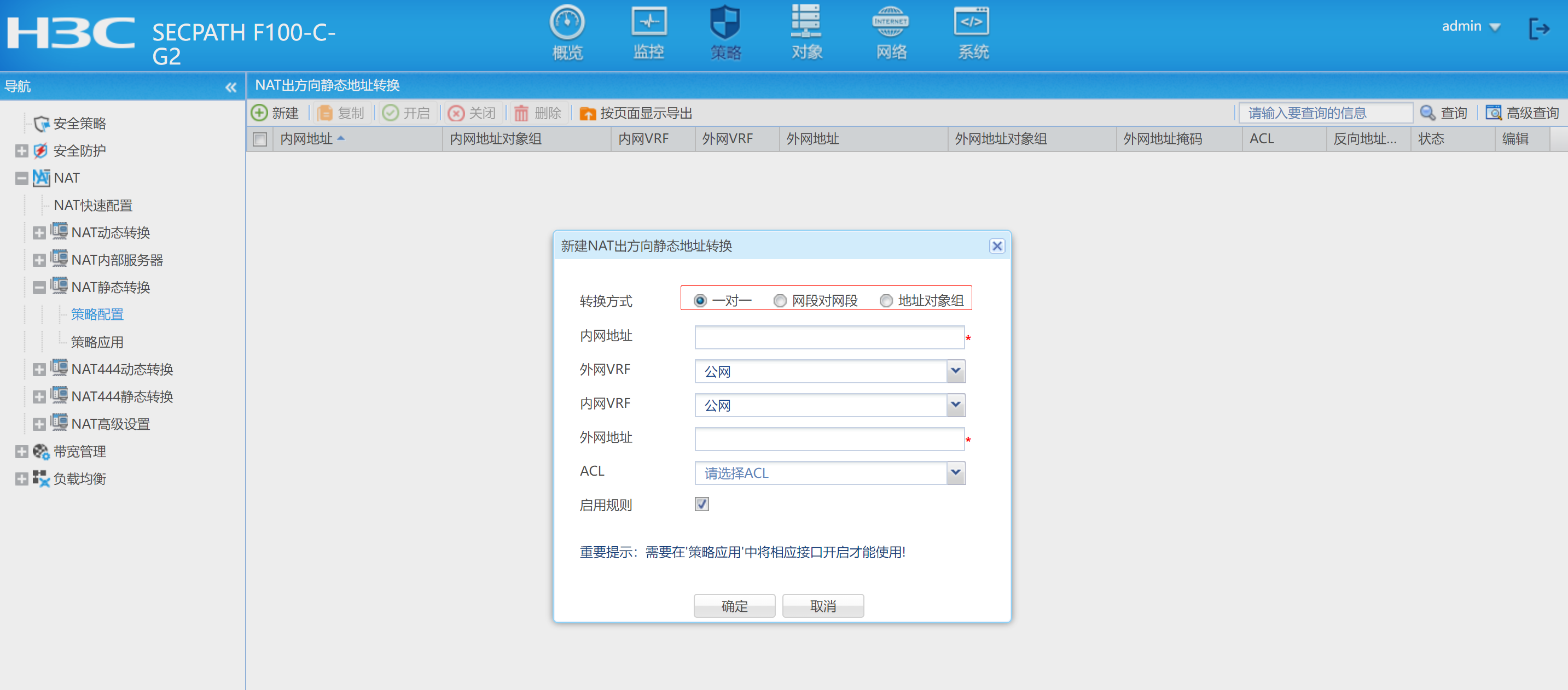 配置页面,内网地址是原地址吧,外网vrf是默认还是配置什么,内网vrf默认还是配置什么,外网地址是转换地址吧,acl要引用不