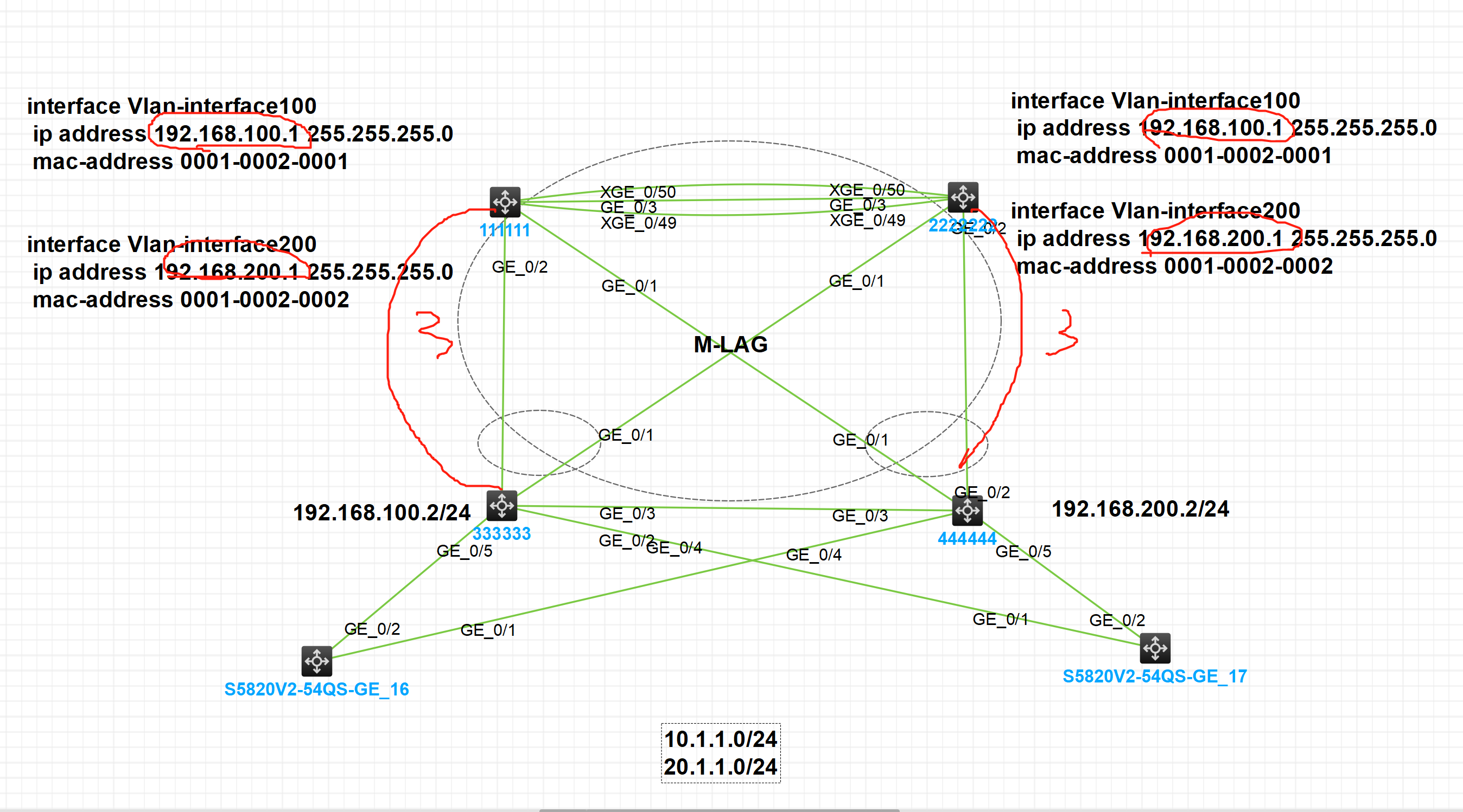 111111和2222222(核心层)以及33333,444444(汇聚层)组成M-LAG系统
