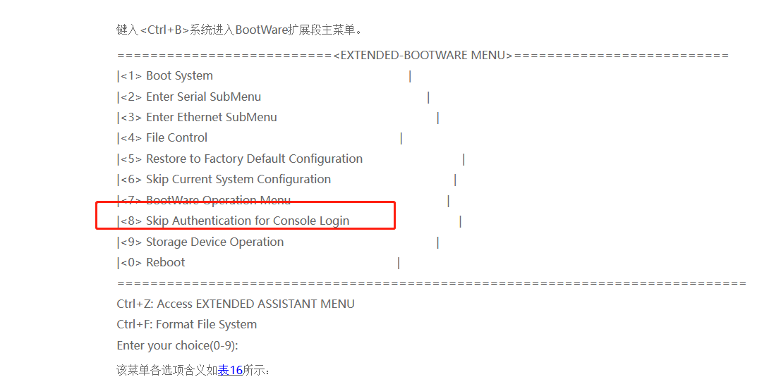 在BootWare扩展段主菜单中选择<8>,回车确认后,系统将跳过Console口认证,选择该选项并重启设备后,设备将以下次启动配置文件启动,但会跳过Console口认证密码,即让配置的Console口认证密码在启动时不生效。