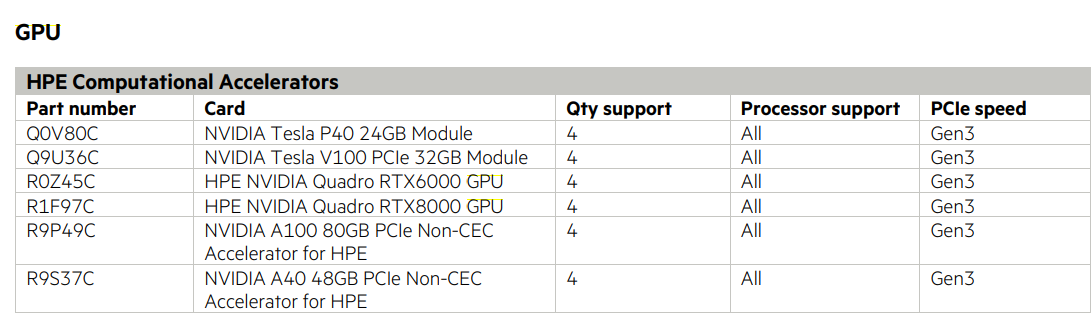 https://www.hpe.com/psnow/doc/a00021850enw?jumpid=in_hpesitesearch手册42页显示支持的GPU有RTX6000 RTX8000 A100 A40 P40 V100等显卡,具体看手册支持情况。