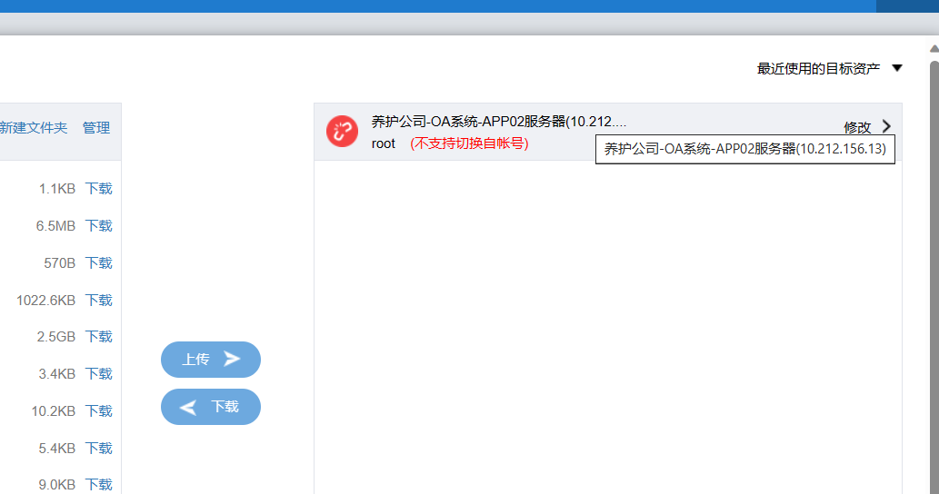 运维审计堡垒机上传文件选中服务器之后,提示不支持切换自帐号,请问是什么原因