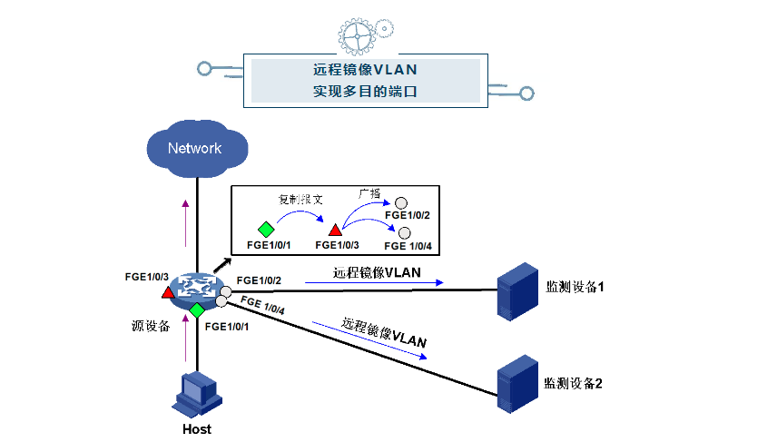在本地端口镜像中提到,多数交换机只支持一个镜像组内配置一个目的端口,我们可以通过远程镜像VLAN,利用源设备的反射端口将镜像报文在远程镜像VLAN中广播的原理实现。实现多目的端口的需求;