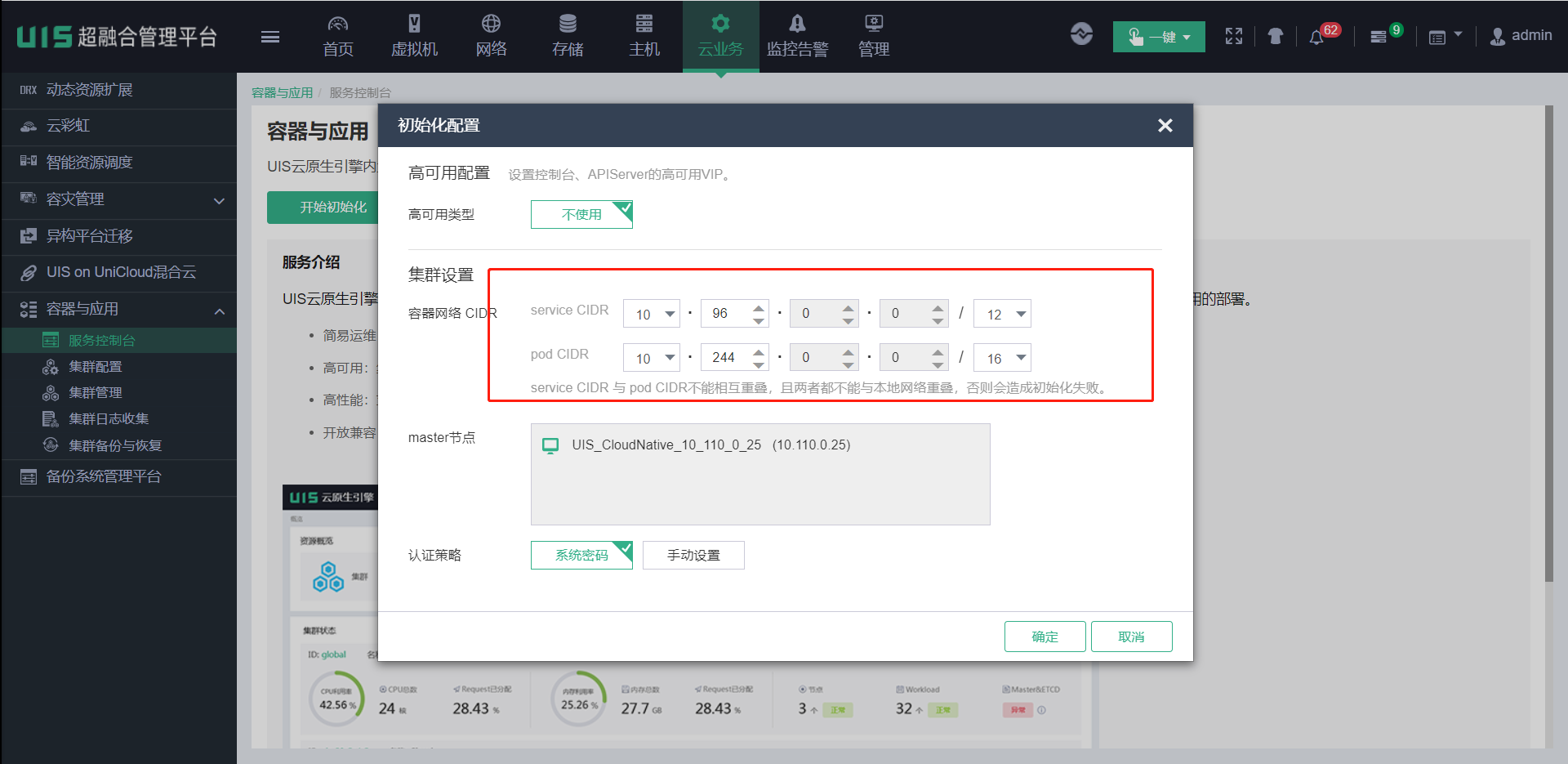 云容器容器间的网络网段,不能和需要布的主机的IP网段相同,目标机器是容器将要运行所在的主机