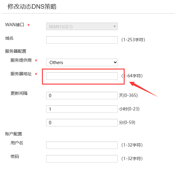 5. 在DDNS设置页面,您需要提供服务器地址或主机名。通常,这是您想要进行动态DNS解析的服务器的公网IP地址或主机名。