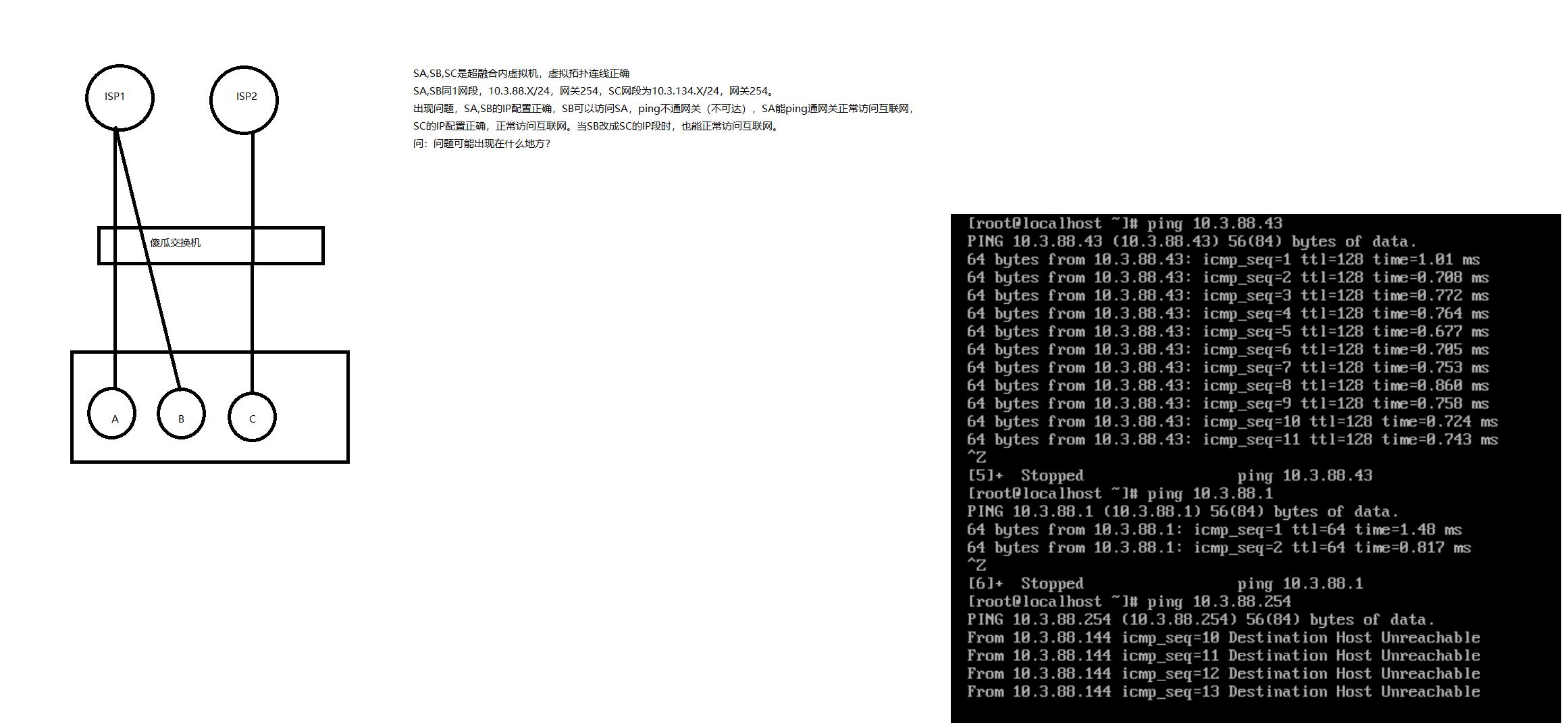 如图SA,SB,SC是超融合内虚拟机,虚拟拓扑连线正确SA,SB同1网段,10.3.88.X/24,网关254,SC网段为10.3.134,X/24,网关254出现问题,SA,SB的IP配置正确,SB可以访问SA,ping不通网关(不可达),SA能ping通网关正常访问互联网,SC的IP配置正确,正常访问互联网。当SB改成SC的IP段时,也能正常访问互联网。问:问题可能出现在什么地方