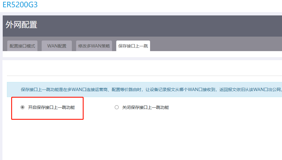 (3) 勾选“开启保存接口上一跳功能”或“关闭保存接口上一跳功能”选项。多WAN场景下,为了确保进入和离开局域网的报文通过同一个WAN接口转发,需要开启保存接口上一跳功能。