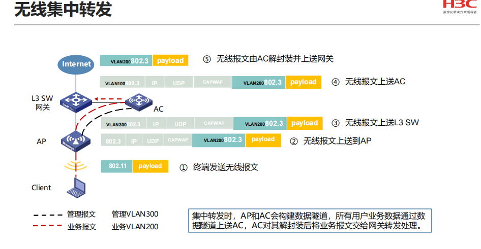 集中转发模式:集中转发时,AP和AC会构建数据隧道,所有用户业务数据通过数据隧道上送AC,AC对其解封装后将业务报文交给网关转发处理。