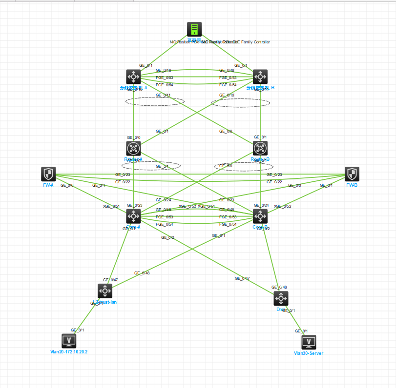 分线交换机vlan10,连接到2台路由器配置2个公网+1个虚拟IP做了vrrp,NAT到下面 2个路由器在配置内网地址做了vrrp,2个路由器是三层接口到核心交换机vlan5