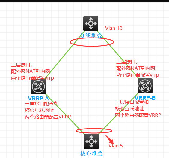 虽然物理上已经环路,但是由于两台路由器部署了VRRP,VRRP会选举出主备,流量主走主设备,当主设备故障了,就会切换到备用设备。