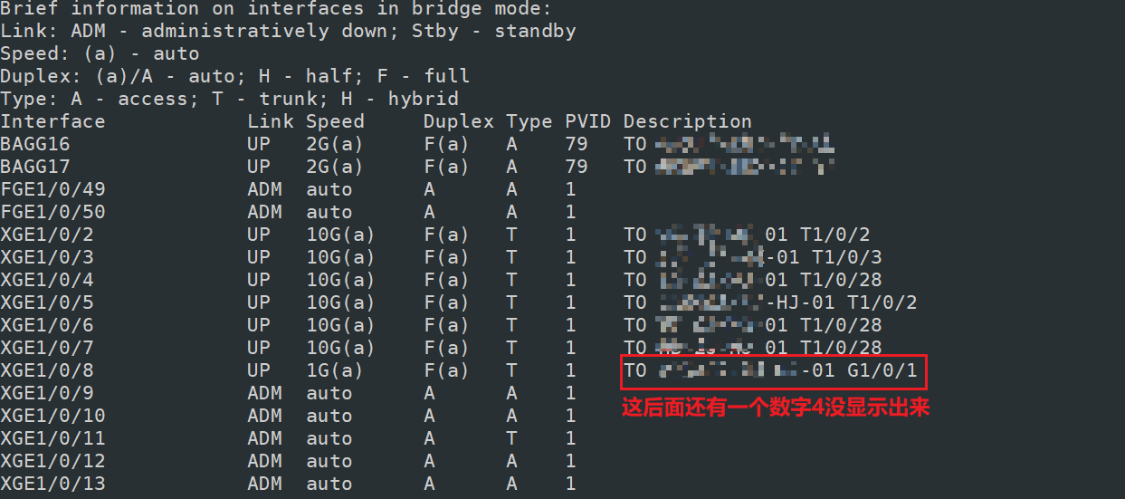 交换机终端使用display interface brief 时单行内容显示不全,例如下图,接口描述里输得是G1/0/14,只显示G1/0/1。