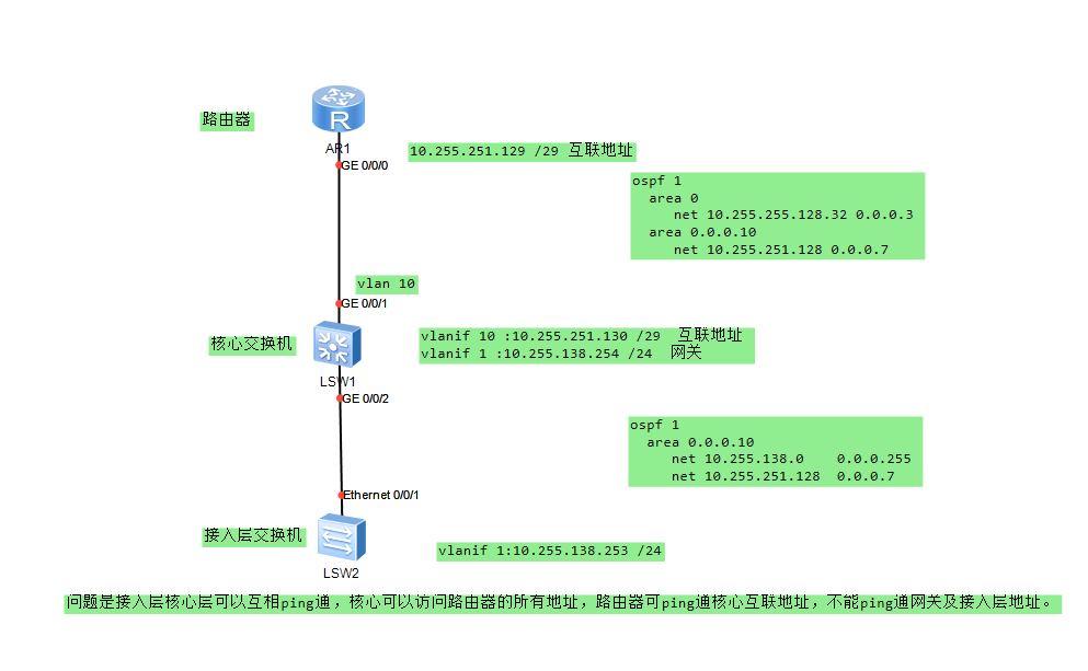 核心交换机可以ping通路由器及之后的设备地址,但是路由器不能ping通核心交换上的VLANIF 1的网关地址,交换机和路由器上路由表均有对方地址