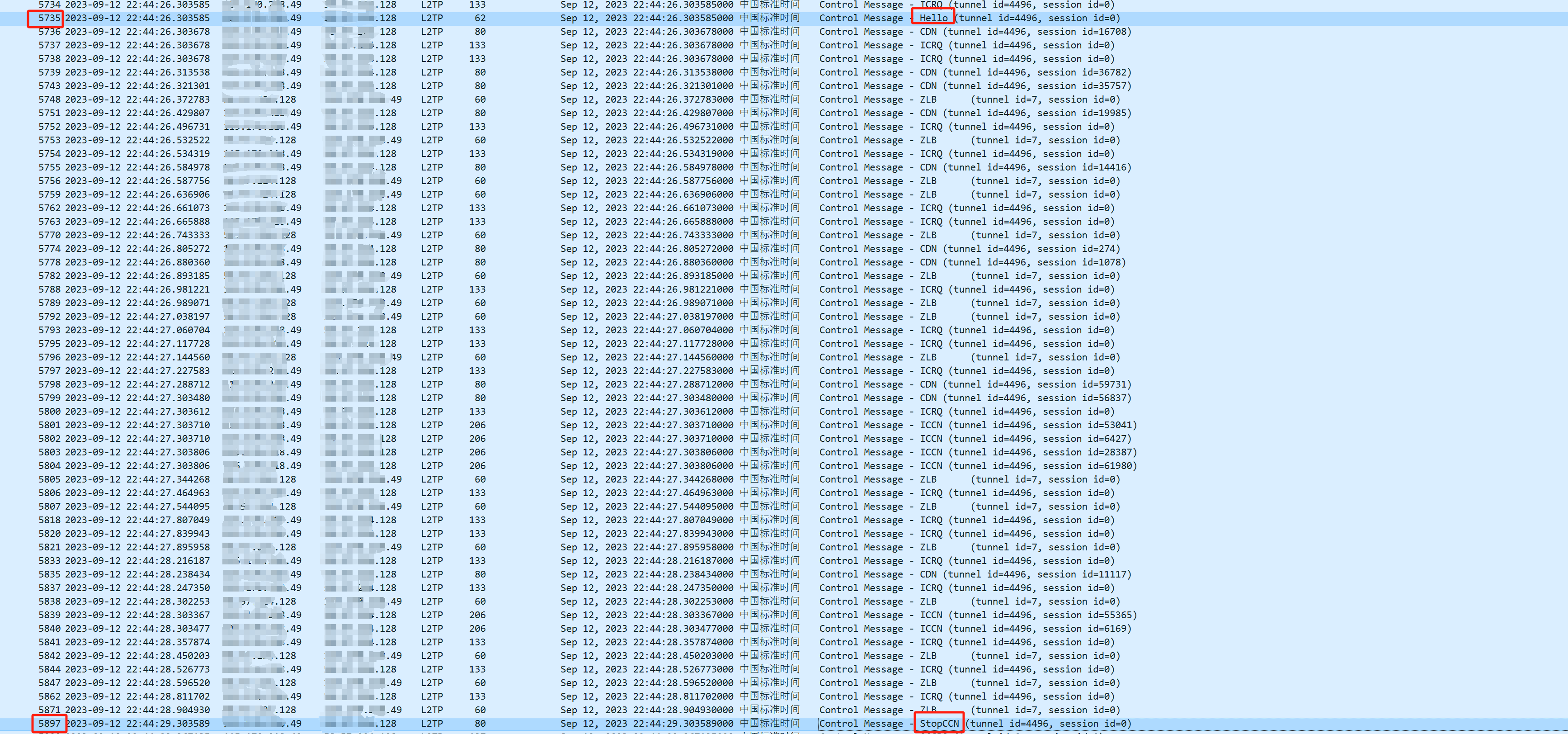 在第5735个LAC发给LNS的Hello包后,LAC发给LNS stop ccn的中断隧道的报文