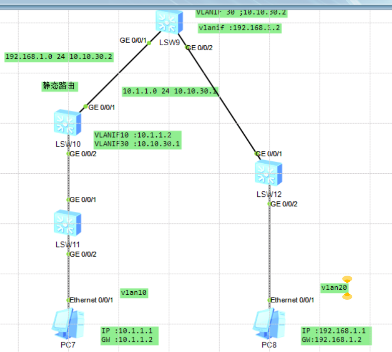 PC7访问PC8的时候的数据会首先到达网关设备,也就是LSW10,在LSW10中vlan10和vlan30是打通的,因此查询路由要去192.168.1.0网段的时候查询路由下一跳去往10.10.30.2,通过vlan30网关10.10.30.1去到LSW9,在LSW9也是通过网关直接进入vlan10(这里准确来说已经没有vlan的概念了),通往PC8。路由返回同理。
