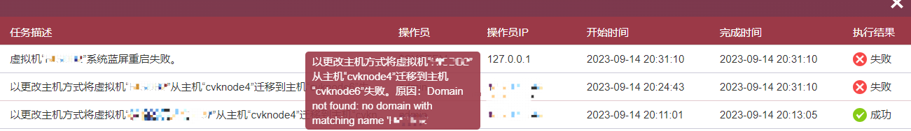 0526版本的CAS,将虚拟机以“更改主机”方式迁移到其他节点主机上失败,提示Domain not found:no domain with matching name'vm_name',随后跟着一个系统蓝屏重启失败,虚拟机业务未中断。有大佬知道怎么回事吗?