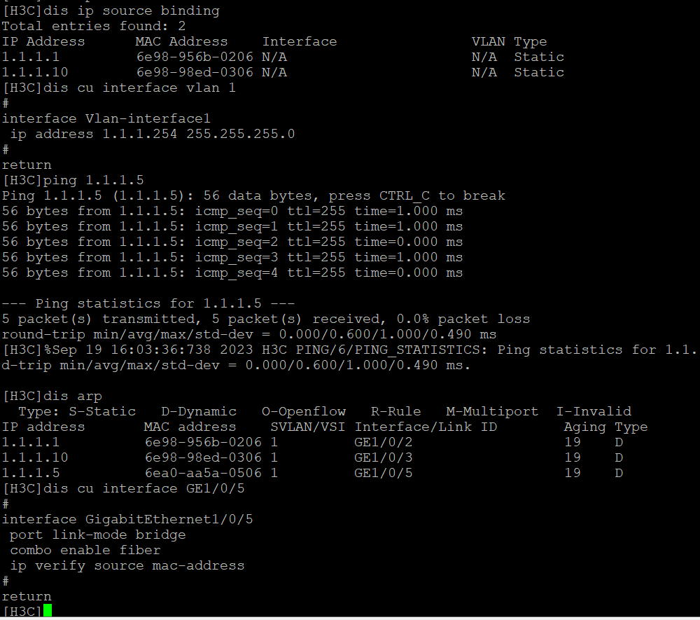 你绑定的方式不对,IP+MAC方法一: 在全局模式使用arp static方式进行绑定,命令如下: arp static 1.1.1.1 0023-24a1-0605;IP+MAC方法三: 进入接口使用动态绑定表项的方式进行绑定,命令如下: int Ethernet 1/0/1 ip source binding ip-address 1.1.1.1 mac-address 0023-24a1-0605 ip verify source ip-address mac-address。二选一操作,你这配置两个都结合了