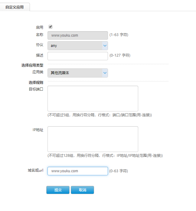 应用审计那里比如没有添加预制的优酷应用,然后我自定义优酷应用URL,怎么写域名都无法识别,依然无法访问