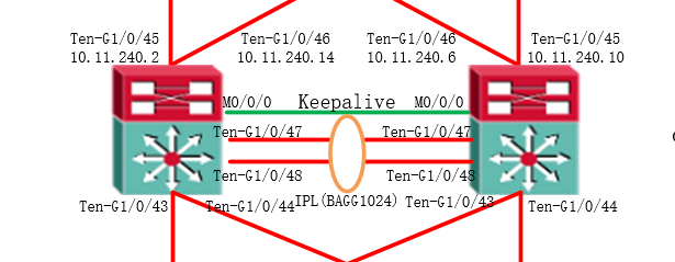 拓扑如下:47-48互联聚合成1024;管理口通过管理交换机互联;做了如下配置发现keepalive和聚合口M-lag协议down