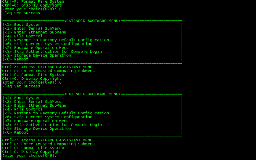 两台S10506X核心交换机,使用IRF虚拟成一台。ssh与console登录都提示密码过期,使用ctrl+B方式进入系统重置密码,选6和8都不能跳过登录系统,选择6或8后,没有输"Y"提示,选0重启后,还是需要输入密码是怎么回事?